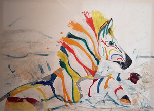 2016Mijn dochter ging, het huis uit, studeren en op kamers wonen. Ik vond de zebra wel symbolisch voor de kleurrijke veranderingen in haar en ons leven. De zebra neemt onverschrokken de sprong naar de overkant.